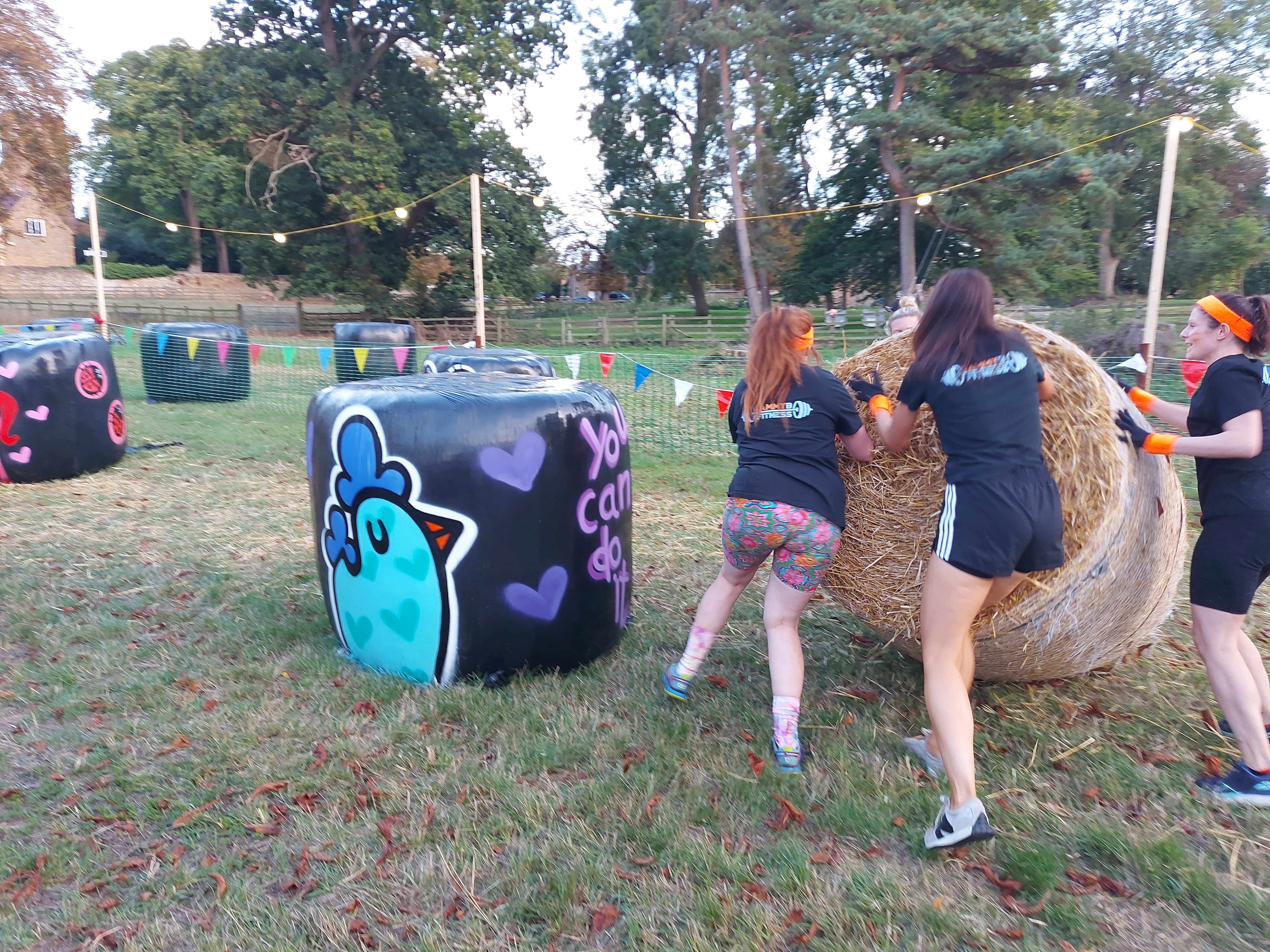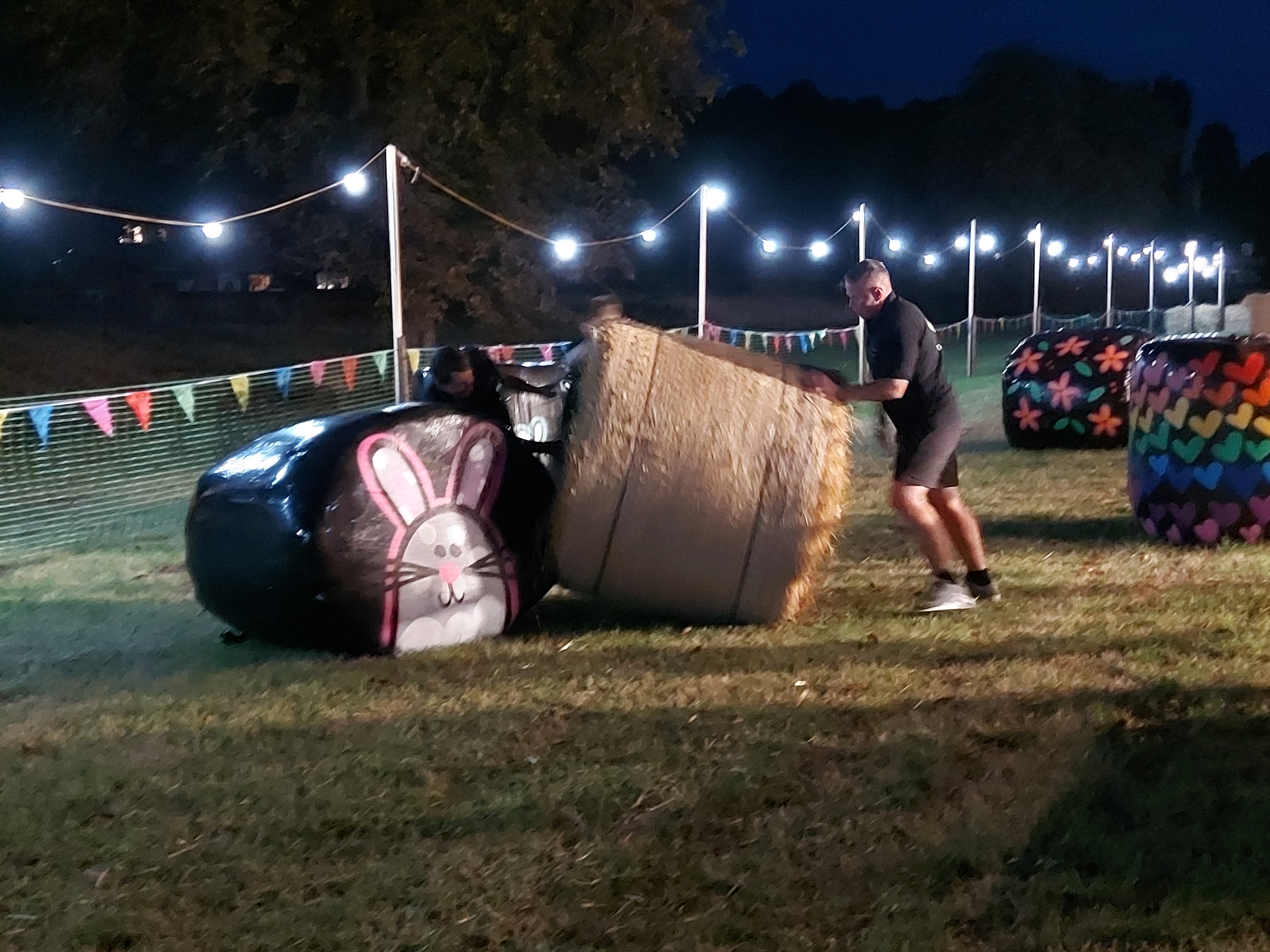 As the setting sun illuminated the infamous manor, teams of ≤4 took it in turns to push a large hay bale (one of the round ones) round a circuit strewn with other hay bales, wrapped in plastic and painted by a local artist who paints wheelie bins.