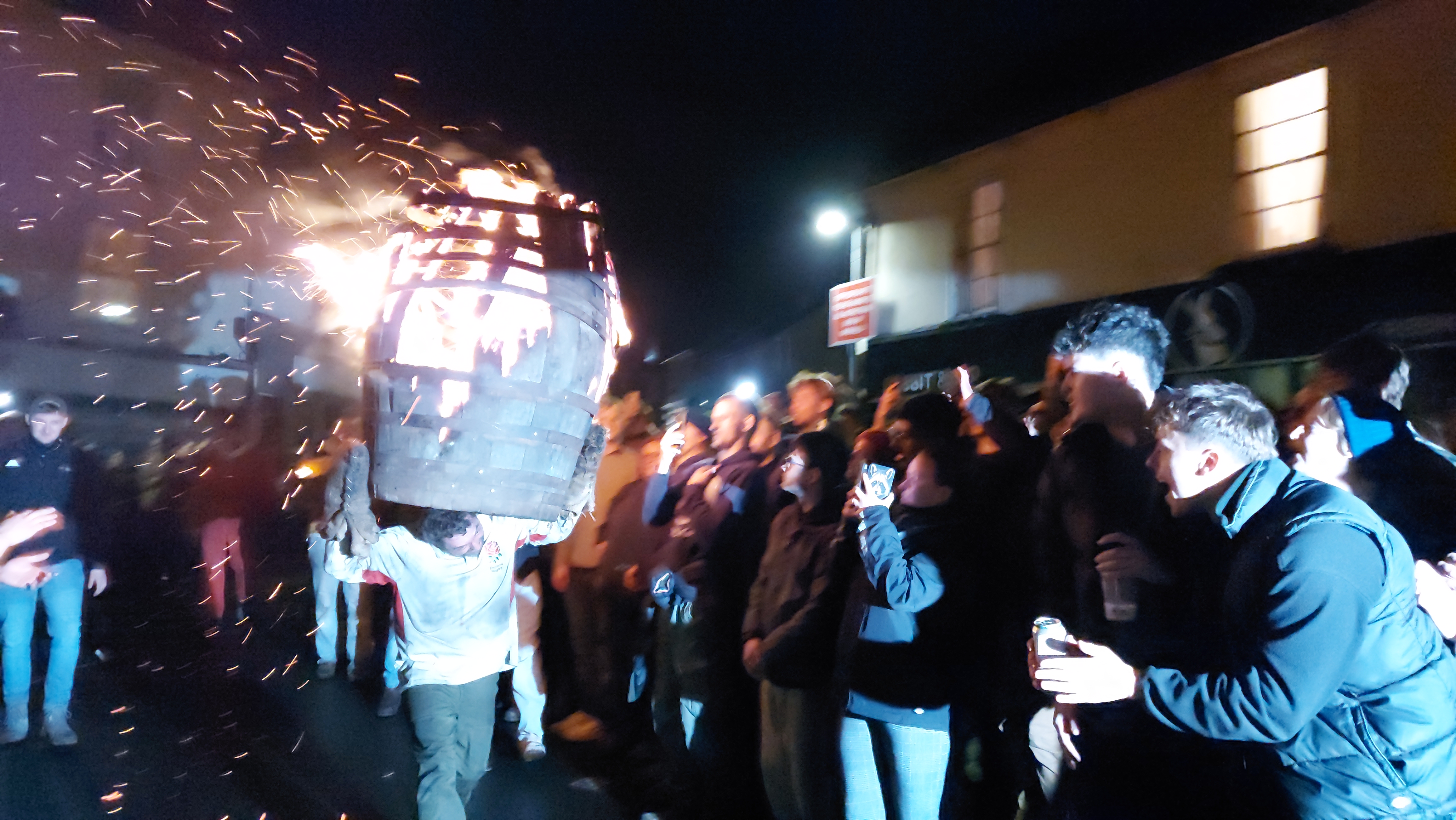 At 4pm, several "cannon" shots rang out and a barrel, lined with tar and with petrol doused straw inside, was set ablaze. Then, after the inferno had set in, it was lifted aloft by an adolescent who ran with it, before passing it to another, who then ran back. It went thus, back and forth, carried by a plethora of teenagers along the short section of road.
